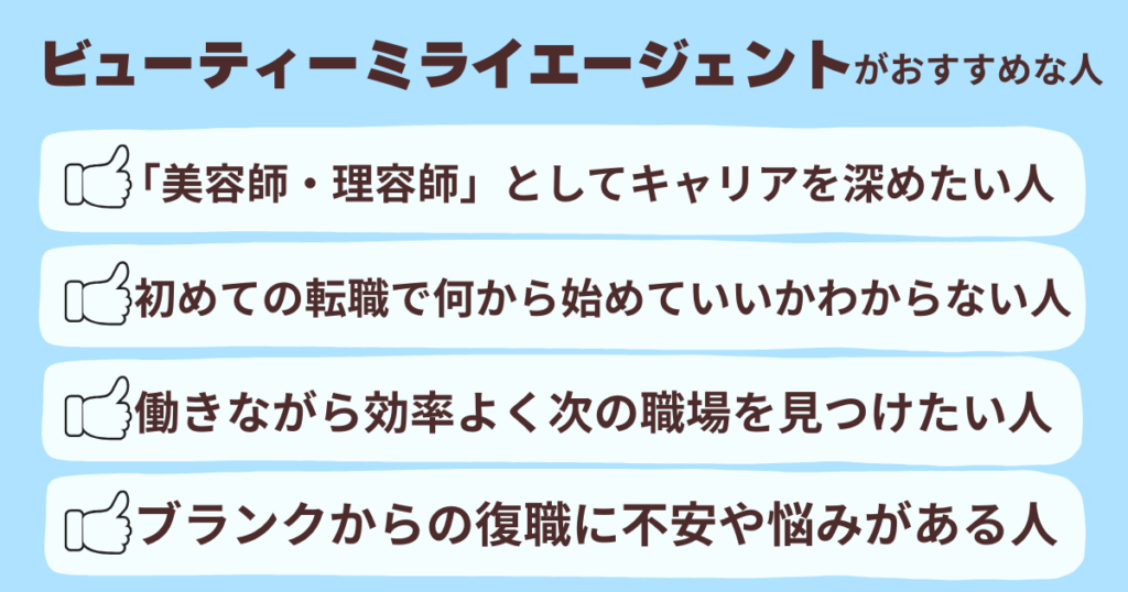「美容師・理容師」に特化した深いサポートが強みのビューティーミライエージェントは、初めての方やブランクがある方の転職もプロが丁寧に並走してくれます。